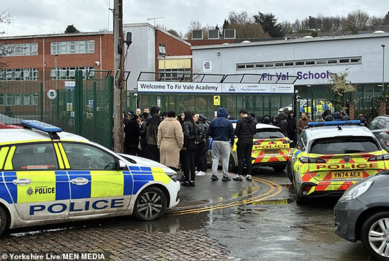 A chaotic scene unfolded Thursday afternoon at Fir Vale Academy in Sheffield, England, after a large fight erupted between students, prompting a heavy police response and reports that two teachers were rushed to the hospital.
