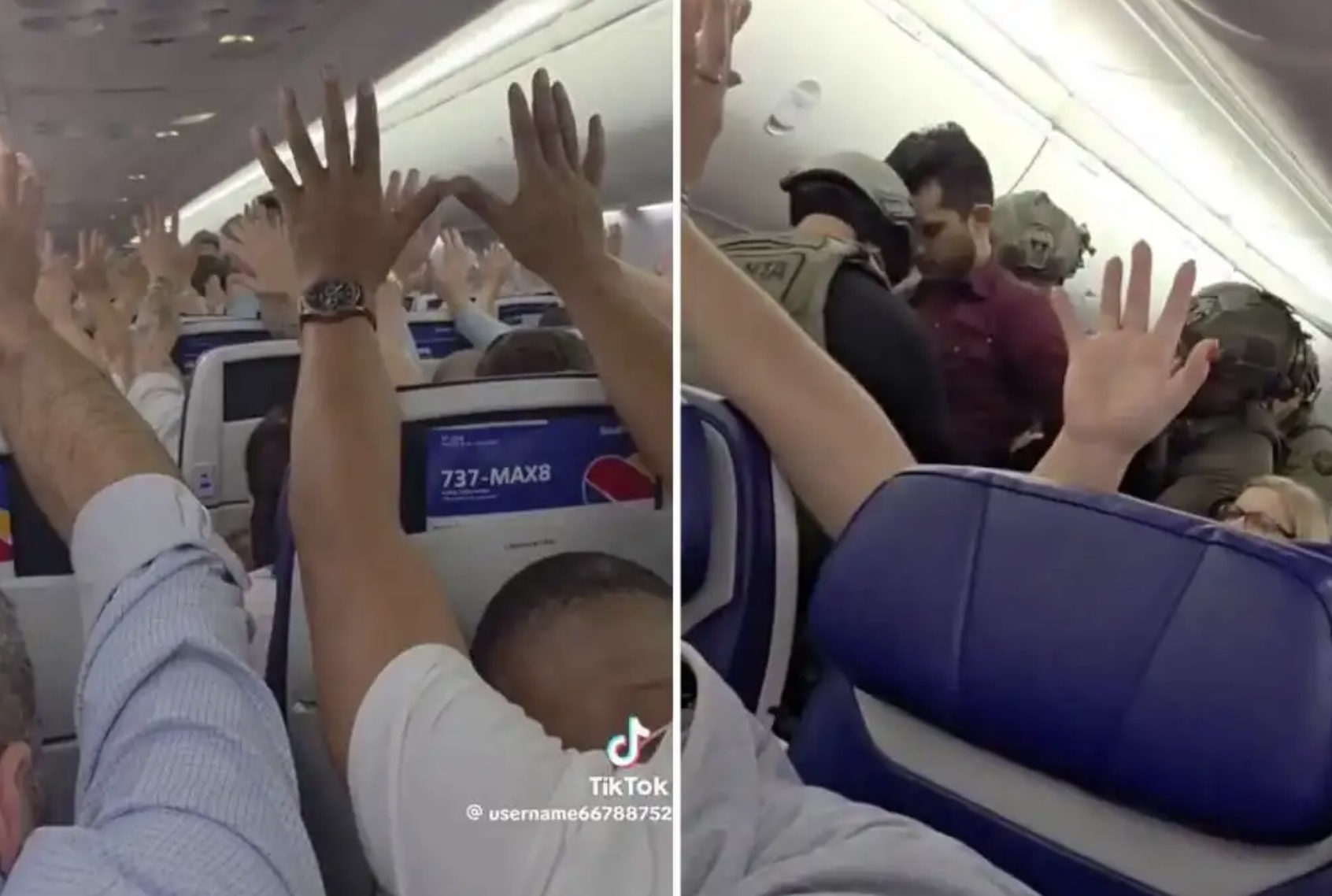 Video circulating on social media shows passengers raising their hands as police in tactical gear approached a man seated on the plane. Officers shouted commands before placing the passenger in handcuffs and dragging him down the aisle.